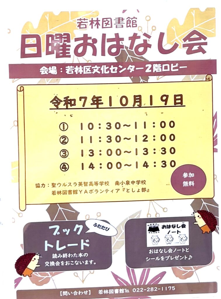 10月19日(日)若葉区民まつりのイベントとして日曜おはなし会(若林図書館主催)が行われ、聖ウルスラ学院英智高校生がボランティアとして活躍し、若林区民まつりを盛り上げました。ブックトークや読み聞かせなど、若林図書館の職員の指導を仰ぎながらしっかり努めました。