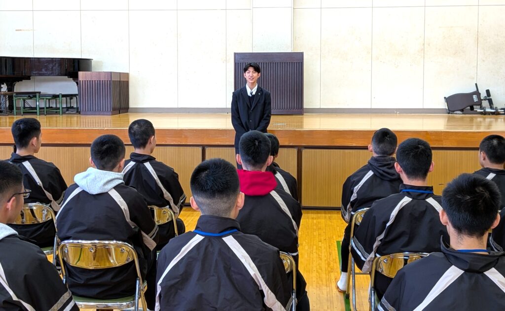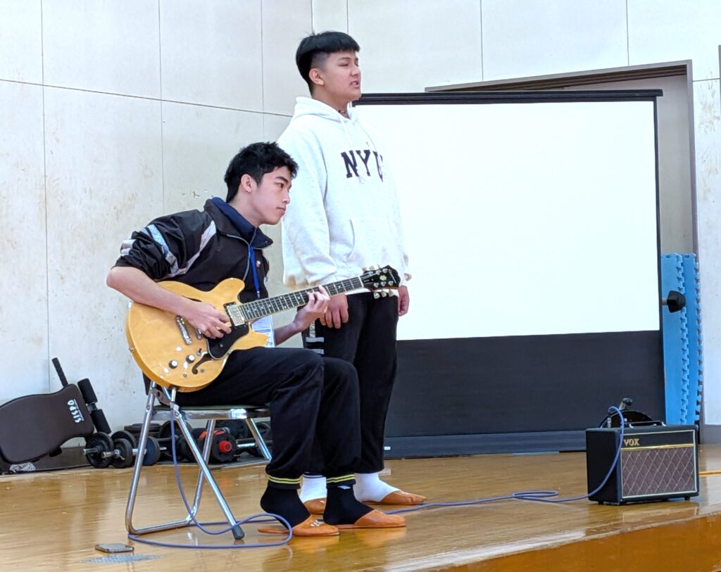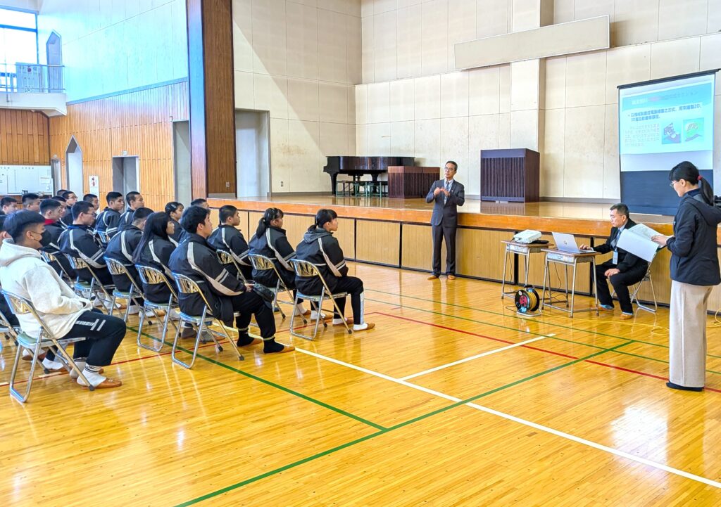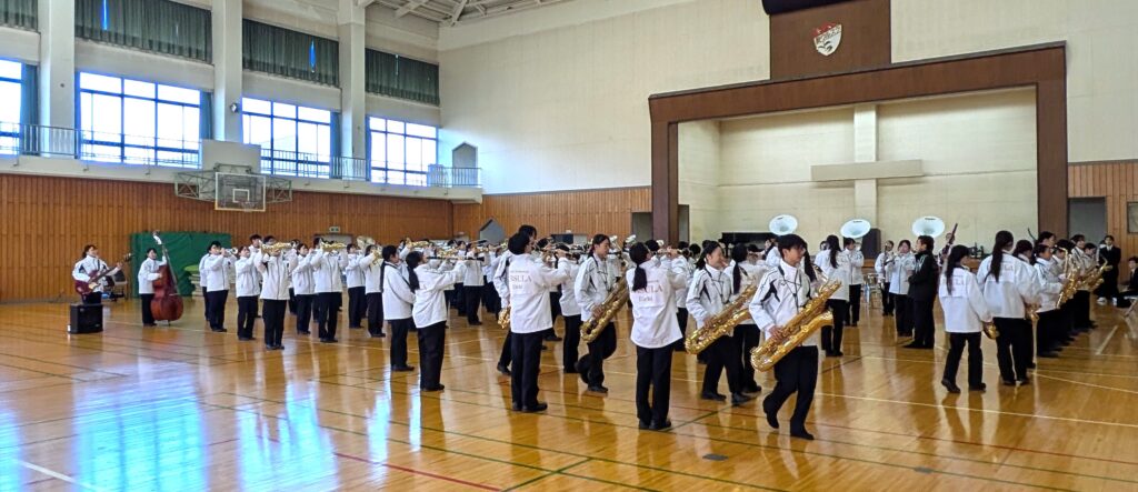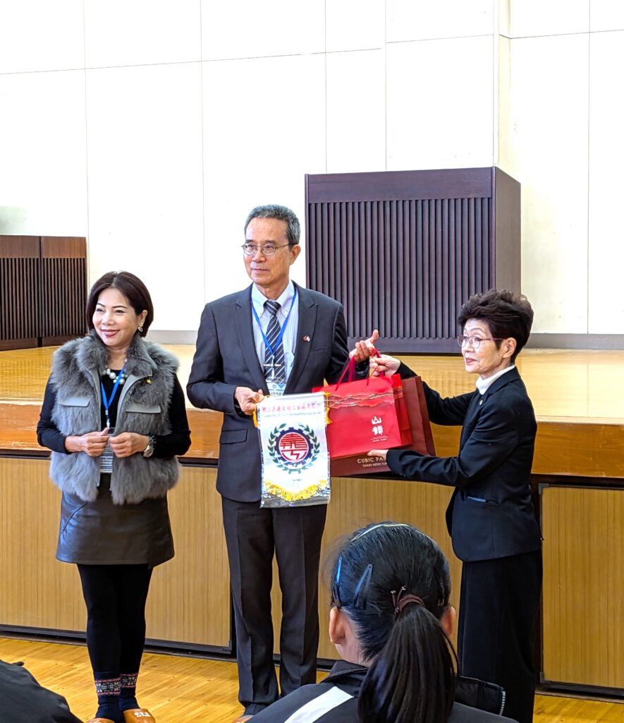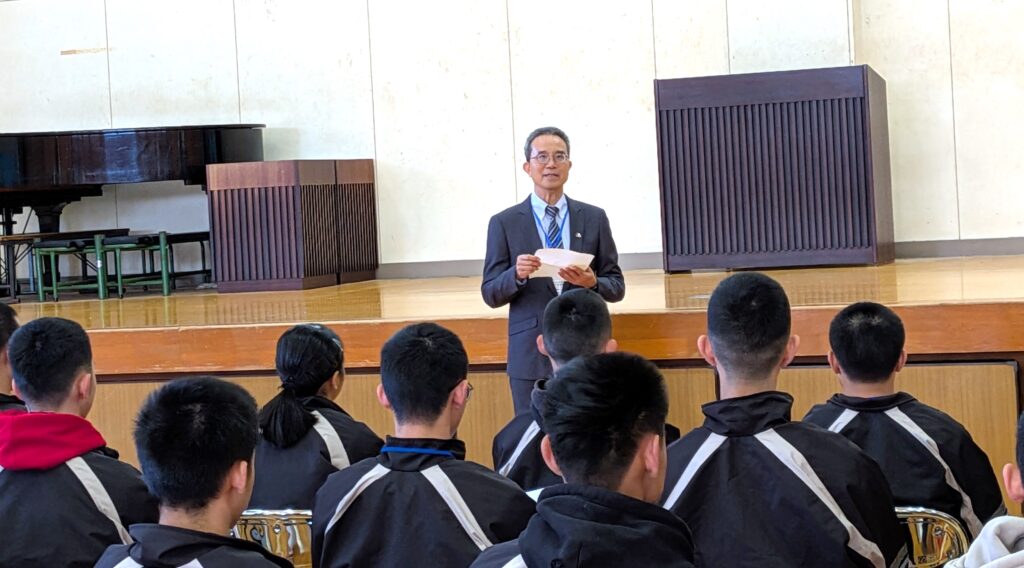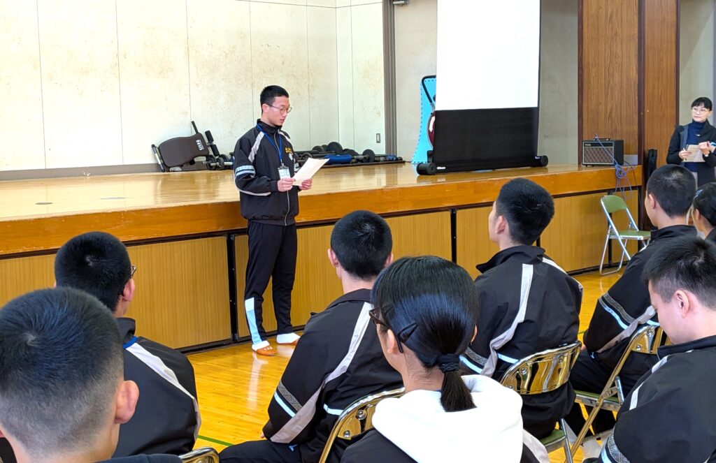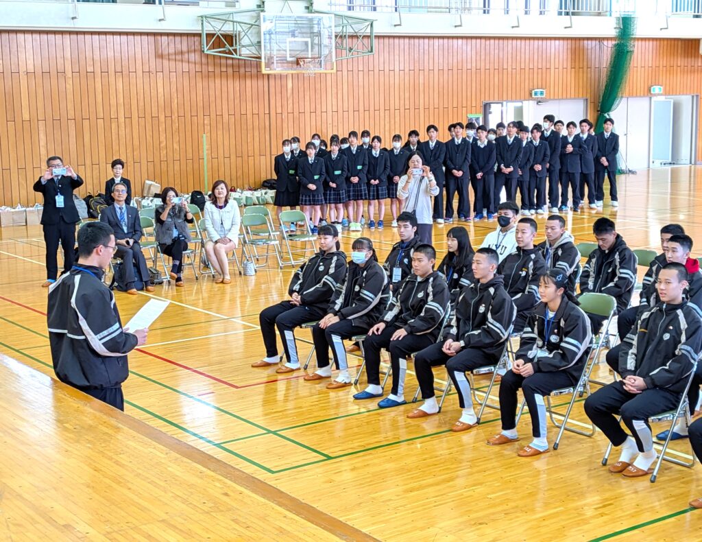 12月1日~2日の2日間、台湾の國立嘉義高級工業職業學校との交流会が行われます。交流会には、國立嘉義高級工業職業學校バドミントン選考生徒26名及び一般生徒4名が参加しています。バドミントン部の合同練習や書道体験等を通して交流を深めることになっています。本日は、体育館にて歓迎式典が行われ、本学院吹奏楽部が歓迎演奏を披露しました。その歓迎演奏に応える形で國立嘉義高級工業職業學校の生徒たちは、ギター伴奏による歌声を披露してくれました。その後、本学院代表生徒による歓迎の言葉、台湾代表生徒によるお礼の言葉、記念品交換、集合写真撮影と進み、歓迎式典を成功裏に終えることができました。