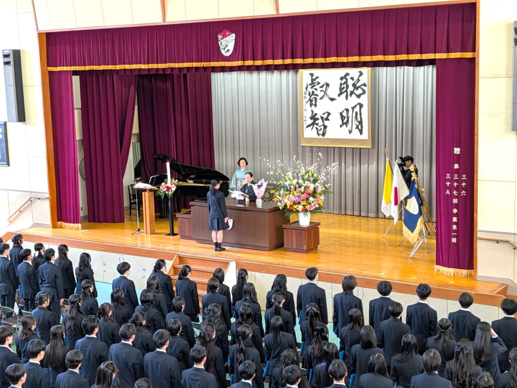 暖かな日差しに春の訪れを感じる良き日に第65回卒業証書授与式が行われました。伊藤校長から282名の卒業生一人ひとりに卒業証書が手渡されました。我々教職員は卒業生の3年間の歩みを振り返り、卒業式に向けた担任の先生方の熱い想いを受け止め、教職員一丸となって卒業式に臨みました。校長式辞では、2011年の東日本大震災の時に幼稚園に入学し、小学校4年生の時にはコロナによるパンデミックなど困難な18年間を乗り越え成長された卒業生へメッセージを送りました。葛藤しながら学び取った「心と知性と理性」の調和、今の自分の姿に自信を持ち、「喜びと希望の種を撒く人」になってほしい。これからのそれぞれの人生には、自分づくりと社会貢献が求められること。愛の実践者として、志を持って自分をより一層高め、志を持って学び続けること。諦めない、逃げない、果敢に挑戦し続けること。自信と誇りと感動する心を持って、感謝する心を持って、かけがえのない命を生きることを忘れないでほしいと式辞を結びました。