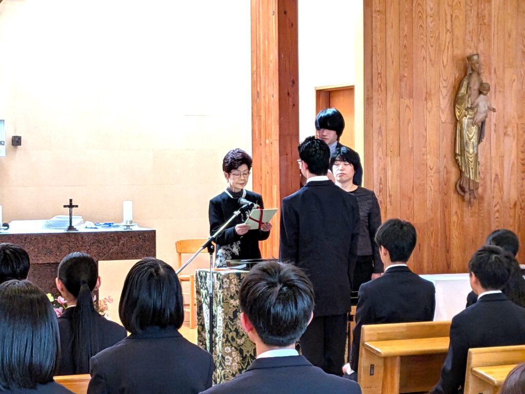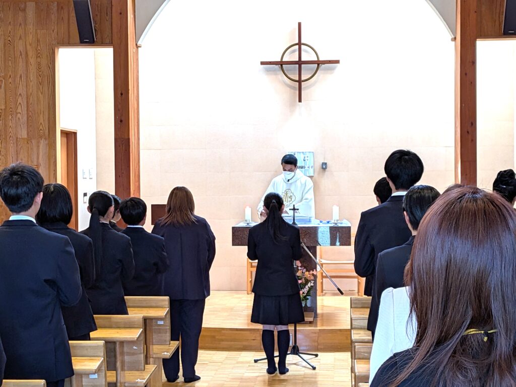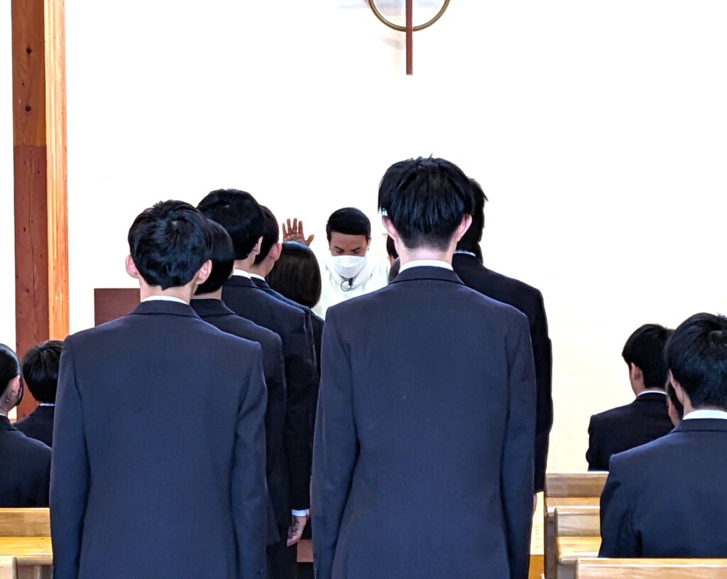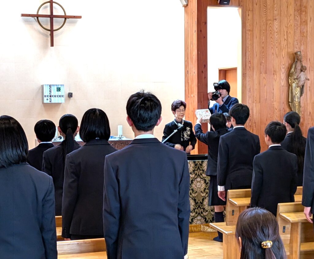 将来の目標や決意を立て、大人になる自覚を促す行事「立志式」及び進級認定証授与式が聖堂で行われました。セカンドステージからサードステージへ進級する62名の生徒たちは、保護者の方々と一緒に神父様から祈願・祝福を受けました。また、伊藤校長及びサードステージの先輩から、心温まるお祝いの言葉をいただきました。生徒たちのサードステージでの確かな歩みと人生の志・18歳成人をめざした節目となる行事となりました。保護者の方々には、年度末の忙しい時期に多数参加していただき心より感謝申し上げます。