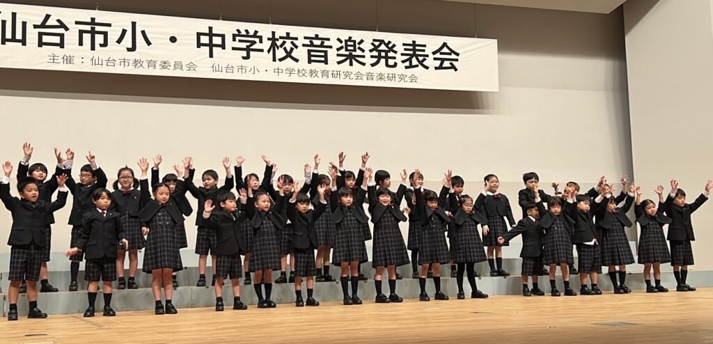 1年生が仙台市小・中学校音楽発表会に出演 2025.10.24 10月24日(金)に、本校1年生が仙台市小・中学校音楽発表会に出演しました。1年生での出演は本校だけでしたが、堂々と元気に発表することができました。最後まで笑顔で歌った1年生は、小さな体からあふれてくるエネルギーが素晴らしいと講評をいただきました。 最新情報一覧 カテゴリー サードステージセカンドステージファーストステージ学校行事等広報部より授業 過去の記事 2025年10月2025年09月2025年08月2025年07月2025年06月2025年05月2025年04月2025年03月2025年02月2025年01月2024年12月2024年11月2024年10月