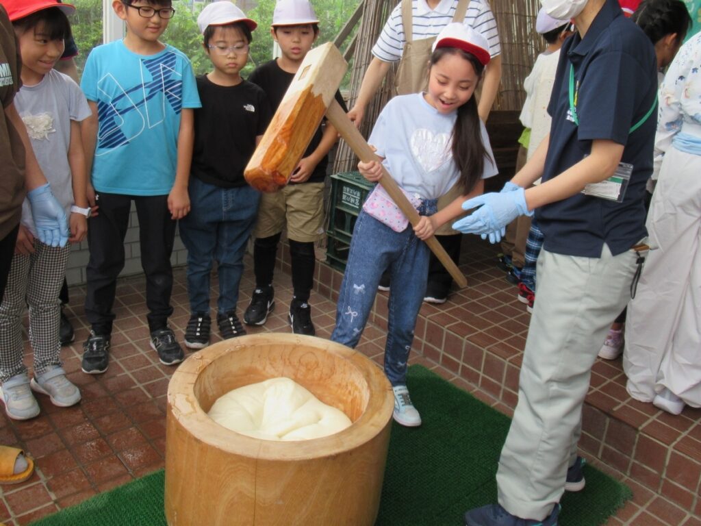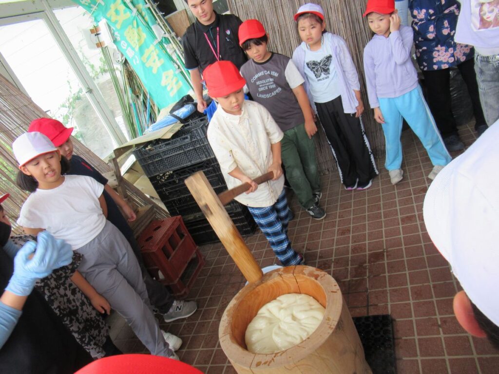 初めての杵の重さや つきたての餅のおいしさに、子どもたちからは、驚きと喜びの声がたくさん聞こえてきました。