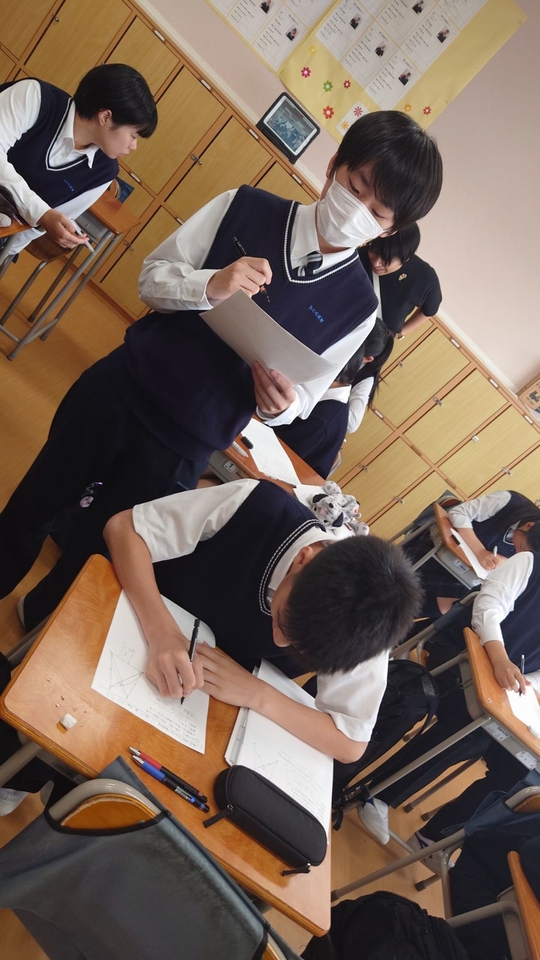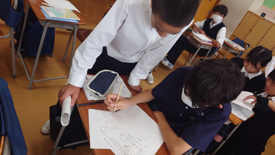 この日は、「二等辺三角形」の学習のまとめとして、合同条件を活用しながら証明をするという演習に取り組みました。