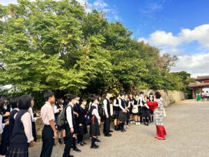 那覇空港に到着後は、首里城公園に移動し、琉球王国に始まる沖縄の歴史を学びながら、補修工事を行っている首里城を見学しました。
